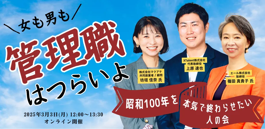 2025年3月3日、XTalent株式会社は国際女性デーを記念した特別オンラインイベントを開催します。「女も男も、管理職はつらいよ 〜昭和100年を本気で終わさ...セミナーを通じて、参加者は管理職に関連する過去の成功例や失敗例を共有しつつ、現代における新しいリーダーシップの姿を見出していきます。