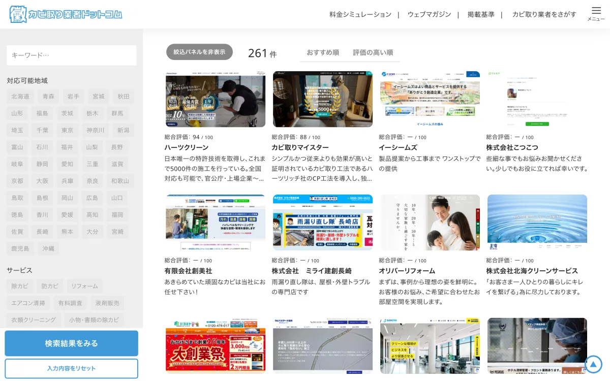 カビ取り業者ドットコムは、株式会社296が運営しており、顧客のニーズに応えるために特別に設計されています。公開時点で、261社のカビ取り業者が掲載されており、評価公開記事も23本あります。更新頻度は月次で、常に最新の情報が提供されます。