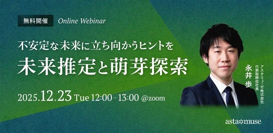 アスタミューゼ株式会社が主催するウェビナー「不安定な未来に立ち向かうヒントを ~未来推定と萌芽探索~」が2025年12月23日(火)に再開催されます。この無料ウェビナーでは、企業が不確実な市況において持続可能な成長を促進するための未来予測手法が紹介されます。