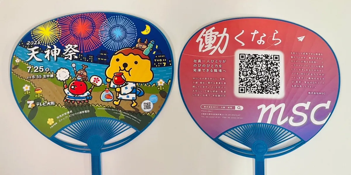 親しみやすいデザインの団扇は、株式会社MSCの入社1年目の若手社員が手がけました。彼女たちは、自身の思いを文章にし、さらにMSCのリクルートサイトへのリンクをQRコードとしてデザインに組み込みました。このシンプルな団扇には、仲間が増えることを願う彼女たちの情熱が込められています。地域の伝統行事である天神祭を通じて、彼女たちの新しい仲間探しの手助けとなることを期待しています。