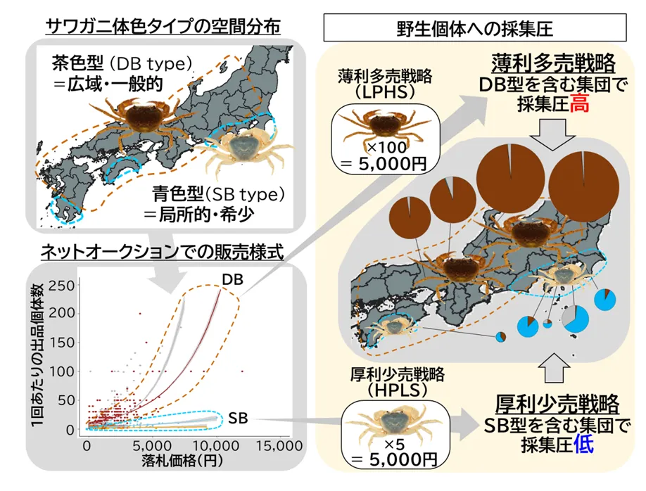 研究では、2013年から2023年までの間に日本の主要なオークションサイトで取引されたサワガニの生体数を解析しました。その結果、44,000個体以上が売買され、茶色型のサワガニが大量かつ低単価で取引される一方で、赤色型や青色型は少量で高単価に設定される販売戦略が取られていました。