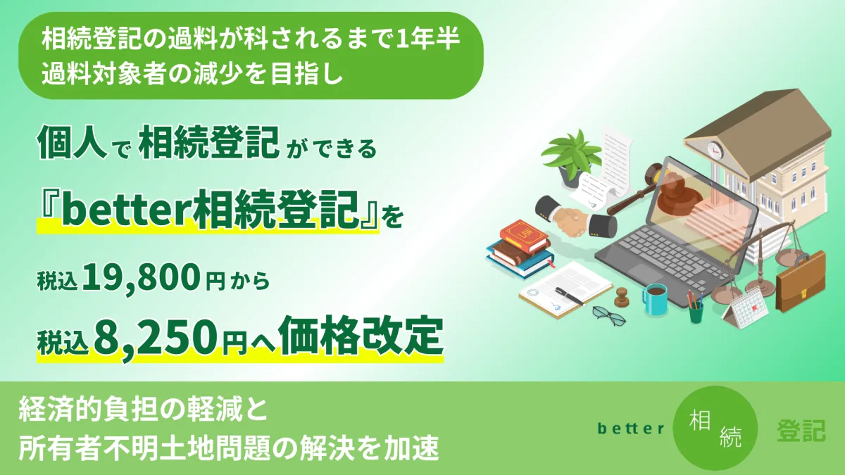 相続登記の義務化が2024年4月1日に施行され、法定通りに手続きを行わなければ過料が科せられる状況が迫っています。これに対抗する形で、相続登記を個人で完結できるWebサービス『better相続登記』が、その価格を2025年10月1日より大幅に改定し、8,250円(税込)に設定しました。この価格改定は、相続手続きに伴う相続対策の難しさを解消し、できるだけ多くの人々が自らの権利を守れるようにする取り組みの一環です。