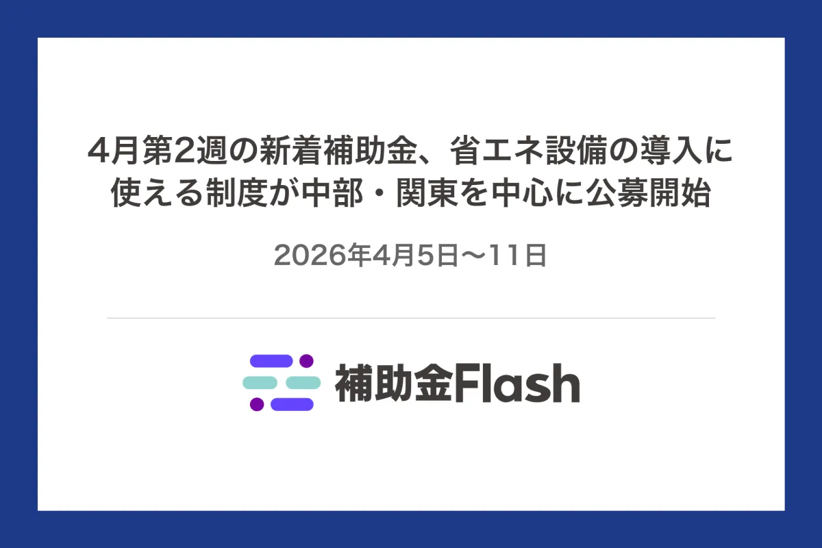 株式会社Franca AIが運営する補助金検索ポータル「補助金フラッシュ」では、2026年4月5日から11日までに公募が開始された164件の補助金・助成金を集計しました。その中から、省エネ対応の設備更新を検討している事業者や経費削減を目指す中小企業に関連した支援制度が多数確認されました。特に、この期間中に新たに発表された補助金20件が、省エネや脱炭素関連の制度でした。