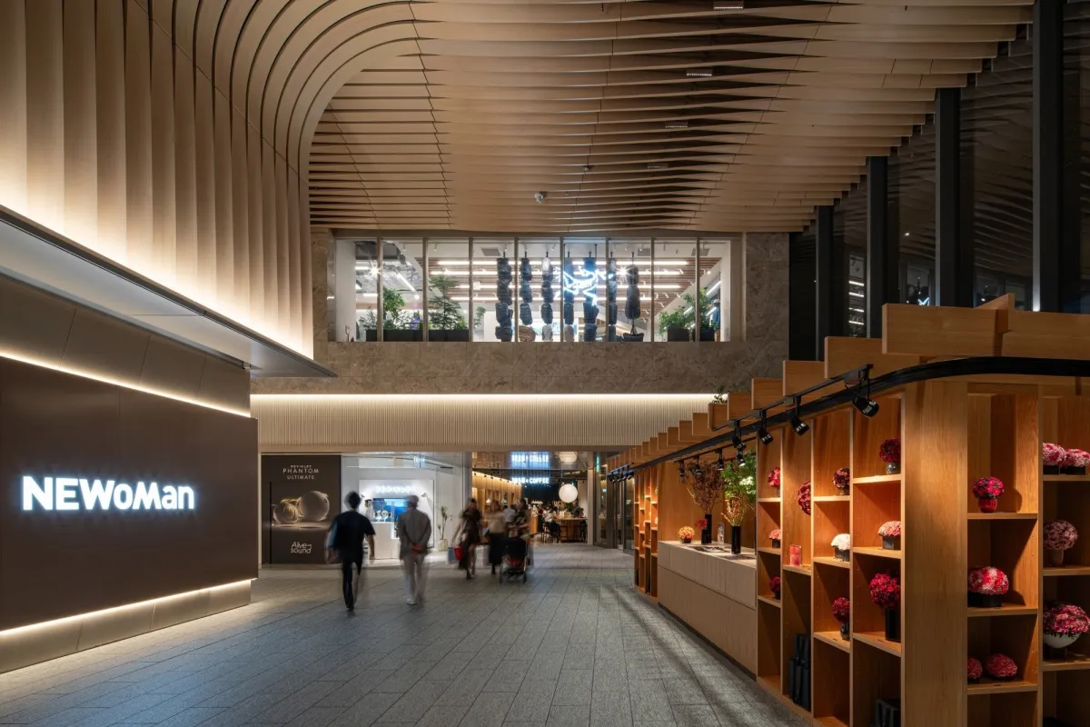ニュウマン高輪は、TAKANAWA GATEWAY CITY内に位置し、ちょうど高輪ゲートウェイ駅に直結しています。学びと遊びが融合した新しいライフスタイルを提案する施設であり、エントランスとエスカレーター周りの吹抜け空間にはファイアライト®が特別に設計されています。