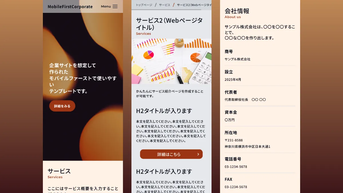 2025年の統計によると、インターネット利用の約90%がスマートフォンからアクセスされています。これを受け、「Mobile First Corporate」ではスマートフォンでの利用を最優先にしたデザインが採用されています。一般的なレスポンシブデザインではPCとスマートフォン両方の見え方を考慮する必要がありますが、モバイルファーストのデザインにより、専門的な知識がなくても、視覚的に最適なウェブサイトが簡単に構築可能です。