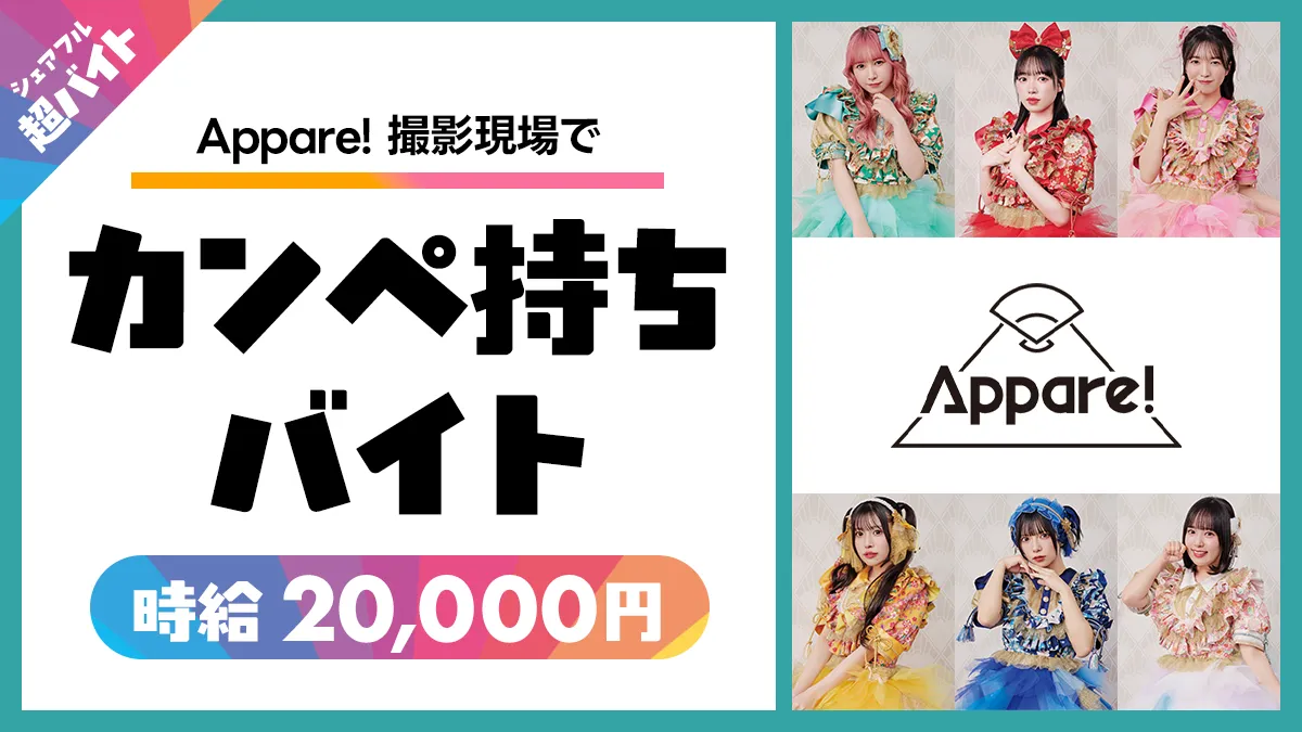 2025年6月24日(火)、アイドルグループ「Appare!」の撮影現場での特別なアルバイト、通称“カンペ持ち”を募集中です。日本国内在住の方で、Appare!のファンや映像業界に興味がある方にとって、これは貴重なチャンスとなります。このアルバイトの魅力は、なんと時給が20,000円という高額なのです。また、対象ポストをシェアフル公式Xでリポストし、自分のスキマ時間を有効に活用できるのが特徴。