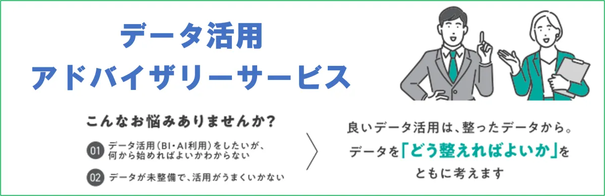 「データ活用アドバイザリーサービス」は、AI導入を効果的に活用する道筋を整えるものです。具体的なサポート内容には、企業が保有するデータを整理し、データの集め方や運用体制など複数の観点から現状を評価し、今後の方針を提案するものがあります。このように整ったデータ基盤を築くことによって、企業はデータドリブンな意思決定や業務の向上を図ることができます。