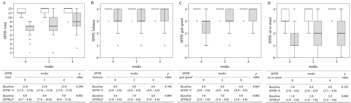 SPPBスコアが9以上のグループにおいては有意な改善は見られなかったものの、SPPBスコアが9以下の低下群ではバランス能力や歩行速度において有意な改善が認められました。具体的には、歩行速度や椅子からの立ち上がり動作などが改善し、下肢機能の向上が実証されました。