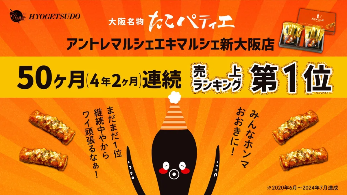 大阪の新大阪駅にあるアントレマルシェエキマルシェ新大阪店で、株式会社瓢月堂が販売する本格たこやきスイーツ「たこパティエ」が、50ヶ月連続でお土産ランキングの1位を獲得した。この記録は、2020年6月から2024年7月までの期間に達成されたもので、驚異的な人気を誇る。