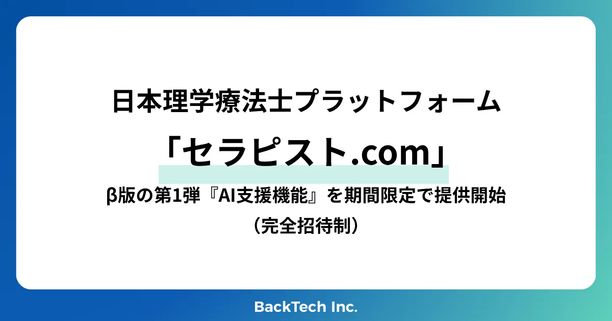 2025年6月26日、株式会社バックテックが開発する日本理学療法士プラットフォーム「セラピスト.com」が初のAI支援機能をβ版としてリリースします。本機能は完全な招待制での提供となり、招待コードを持つ利用者に限定されているものの、期待が高まる内容です。本記事では、このプラットフォームの基本コンセプトやAI機能の具体的な内容について詳しくご紹介します。