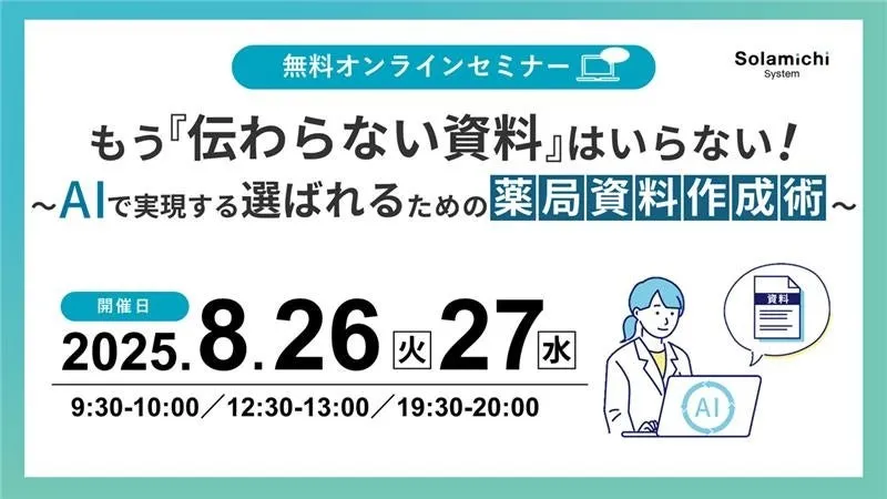 株式会社ソラミチシステムが、8月26日と27日に開催する無料オンラインセミナーは、現代の薬局が抱える「資料づくりの効率化」にフォーカスしています。これは、薬局に勤務する多くの薬剤師にとって、必見の内容です。参加は無料で、誰でも簡単に登録できるので、ぜひお申し込みください。