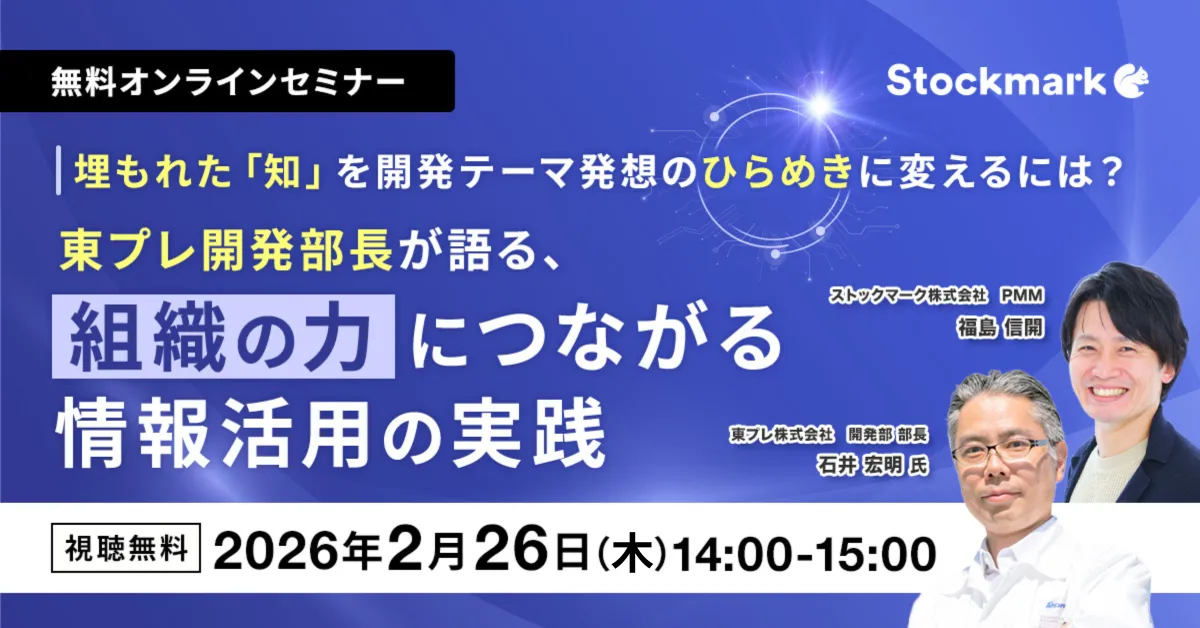 2026年2月26日(木)、ストックマーク株式会社はオンラインセミナー「埋もれた『知』を開発テーマ発想のひらめきに変えるには?―東プレ開発部長が語る、組織の力につながる情報活用の実践」を開催します。この無料セミナーでは、日常の情報収集から得られる知識や過去の知見が、しばしば埋もれてしまうことに焦点を当て、それを発想の原点に変えていく手法について学ぶことができます。