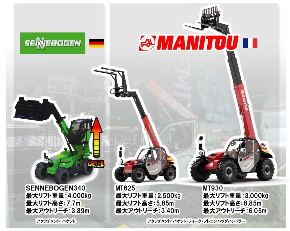 また、ゼネボーゲン社のテレハンドラー「340」モデルも試乗可能で、この機械はキャビンが高く上昇できるため、操作時の視界が広く、安心感を持って運転することができます。こうした機能を実際に体感できるのは、試乗会ならではの魅力です。
