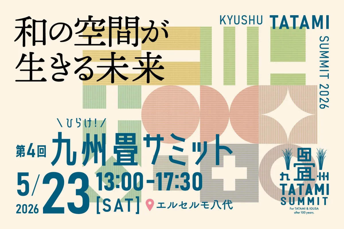 2026年5月23日(土)、九州のい草の一大産地である熊本県八代市で「第4回 九州畳サミット」が開催されます。このサミットは、ライフスタイルの変化に伴い、い草の作付け面積がピーク時の約1/30以下にまで落ち込む中、産地と日常生活を如何に再接続するかを考える重要な場です。