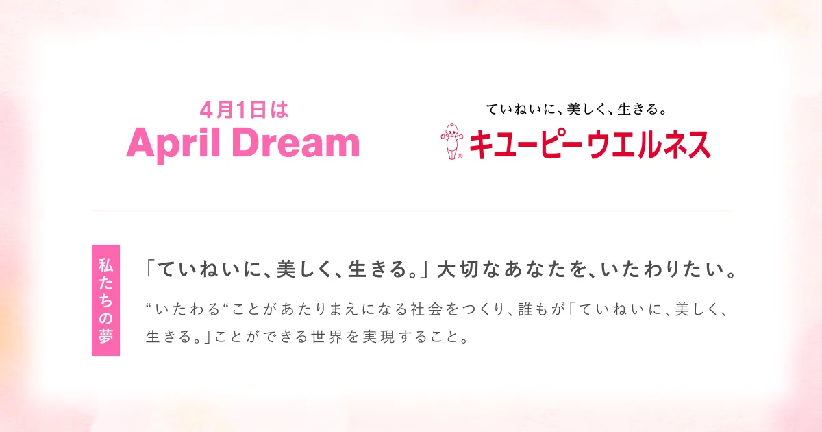 キユーピーウエルネスは、4月1日の「April Dream」プロジェクトにも積極的に参加しています。このプロジェクトは、企業や個人が自身の夢を共有し、共感や支援を得ることを目的としています。キユーピーウエルネスは、自社の理念を内包した夢を発信し、大切にしている価値観を広めるための舞台として活用しています。