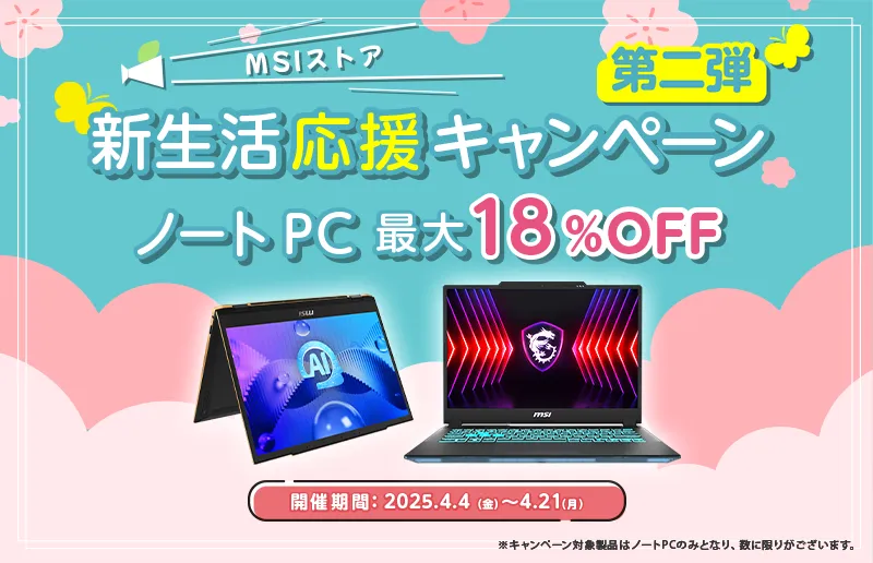 エムエスアイコンピュータージャパン株式会社は、2025年4月4日から4月21日までの期間、MSI公式オンラインショップで「新生活応援キャンペーン」を実施します。このキャンペーンでは、最新モデルを含む対象ノートPCが最大18%OFFというお得な特別価格で販売されます。