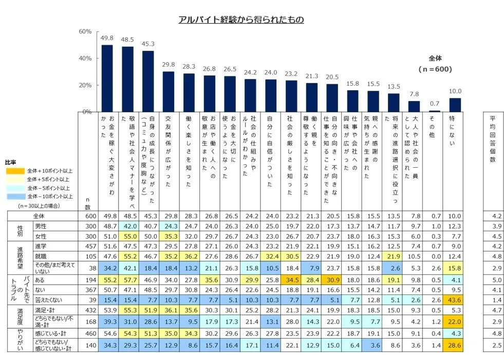 他にも「交友関係が広がった」29.8%や「働く楽しさを知った」28.3%など、アルバイトはただの労働ではなく、人生経験として貴重な教訓となっています。