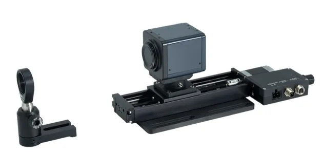 新製品「M²自動測定オプション」は、ビームプロファイラ解析ソフトウェア「LaseView」に電動ステージを組み合わせたオプション形態で提供されます。この電動ステージは、カメラを搭載し、光軸方向に移動しながら複数の位置でビームプロファイルを自動的に取得し、M²値をリアルタイムで解析します。これにより、煩雑な位置合わせの手間を省き、測定スキルの属人化を解消し、作業工数の削減に繋がります。測定操作は専用のソフトウェア上で行うため、ユーザーは簡単に操作できます。
