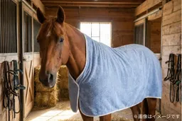 タオルメーカーとしての豊富な経験を持つ日繊商工は、次の対象として馬を選びました。馬は大型動物で、体表面積が広大なため、拭き取りや乾燥に時間と労力がかかります。「馬専用マントタオル(仮)」は、その名の通り、馬をすっぽりと覆い、効率的に拭き取ることができるマント形状のタオルです。これにより、拭く・包む・乾かすという工程を少ない動作で完結させることを目指しています。