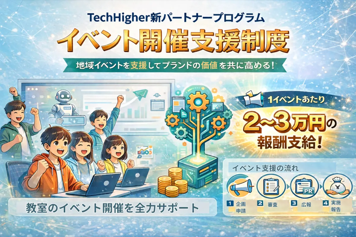 2026年1月1日、株式会社エクシードが運営する10代向けデジタル人材育成サービス『TechHigher』は、新しい試みとして「イベント開催支援制度」を開始しました。この制度は、ライセンス提携校が主催する地域の教育イベントを積極的に支援し、その活動を通じてTechHigherブランドの価値を共に引き上げることを目的としています。
