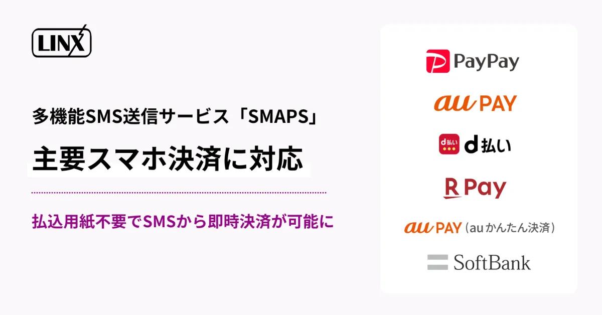 株式会社リンクスが提供する多機能SMS送信サービス「SMAPS」が、新たにスマートフォン決済機能を追加しました。これにより、ユーザーはSMSで受け取った支払い通知に基づき、すぐに決済ができる環境が整いました。主要なスマホ決済サービスとしては、PayPay、au PAY、d払い、楽天ペイ、auかんたん決済、そしてソフトバンクまとめて支払いが含まれています。