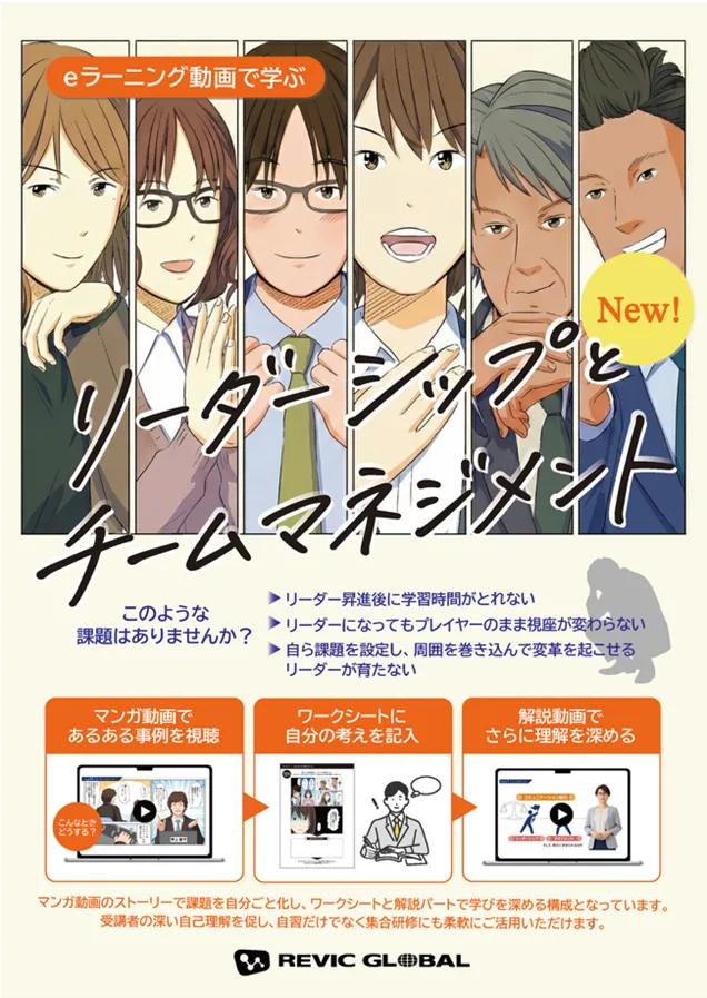 このeラーニング教材は、プレイヤーとしての経験を持ちながらも、リーダーとしての役割を理解しきれずにいる方を支援するために、マンガ動画を用いたストーリー形式で学習できるようになっています。リーダーとしての資質を育むための基礎力を短時間で養うことが可能です。