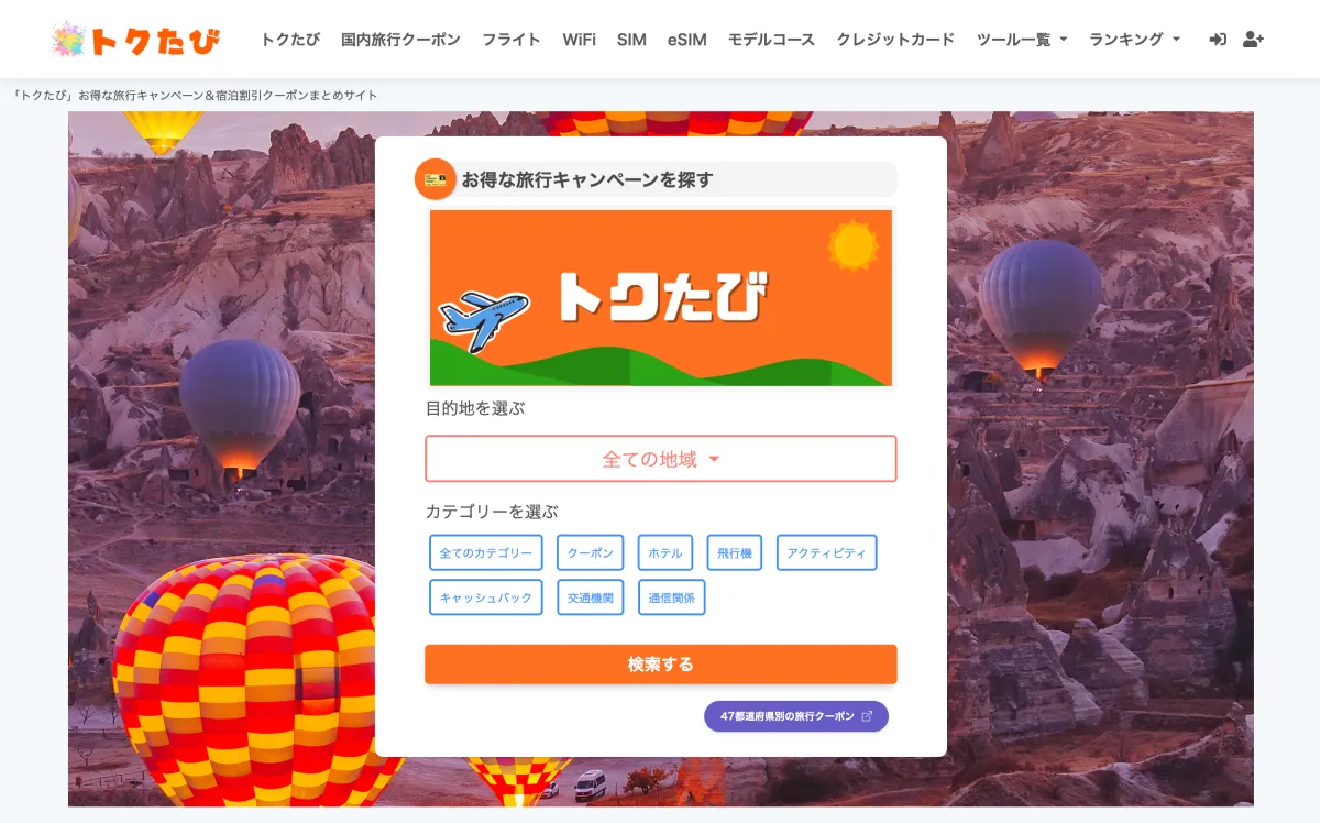 『トクたび』は、旅行に関する多岐にわたる勧告情報を一元化したサイトです。航空券の予約から宿泊施設、WiFiやアクティビティの予約まで、旅行に必要なキャンペーン情報を手軽に検索できます。ユーザーは地域やジャンルを選ぶだけで、どのサイトでどのようなキャンペーンが行われているかを簡単に把握することができます。