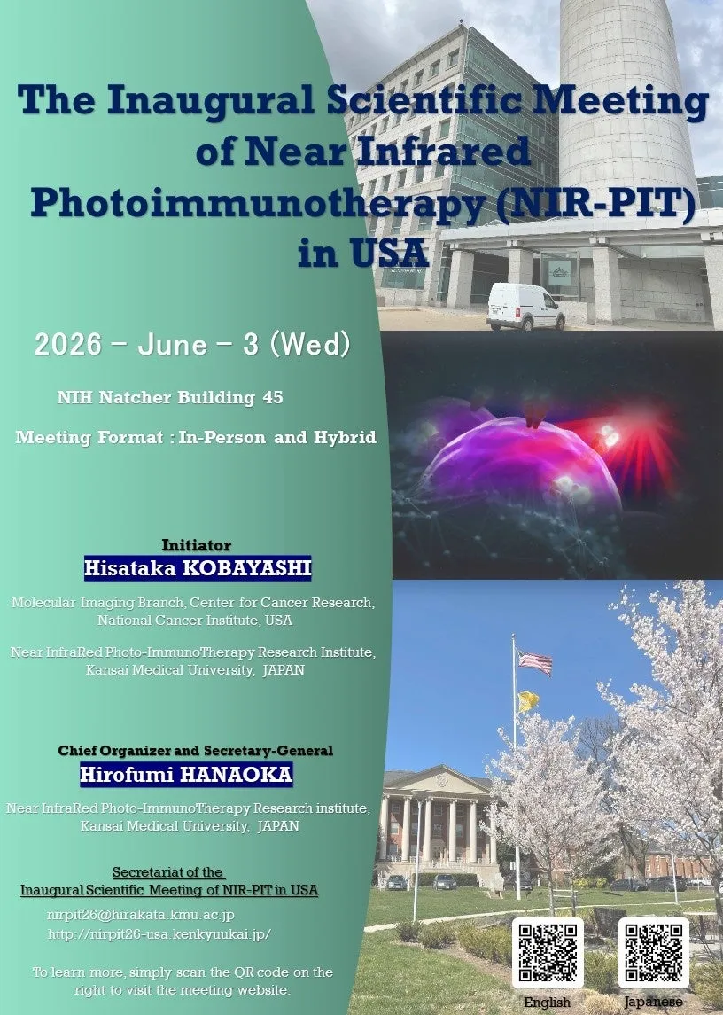 そんな中、2026年6月3日(水)にはこの光免疫療法に特化した初の国際研究会「The Inaugural Scientific Meeting of Near-Infrared Photoimmunotherapy(NIR-PIT)」が米国メリーランド州ベセスダの国立衛生研究所(NIH)で行われます。この重要な会議には、日本をはじめ、米国や欧州の研究者、臨床医が集まり、近赤外光線免疫療法に関する基礎研究から臨床試験、さらには新たな分子標的や薬剤開発に至るまで多岐にわたる議題が議論される予定です。
