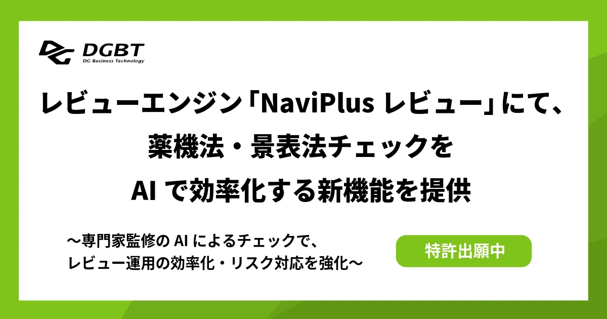 デジタルビジネス総合支援を行う株式会社DGビジネステクノロジー(DGBT)は、ECサイト向けレビュー管理サービス「NaviPlusレビュー」において、特許出願中の新機能「AI法令サポート」を提供開始した。この機能は、AI技術を用い、薬機法や景表法に関連するレビューのチェック業務を効率化するものであり、業界初の試みとされている。
