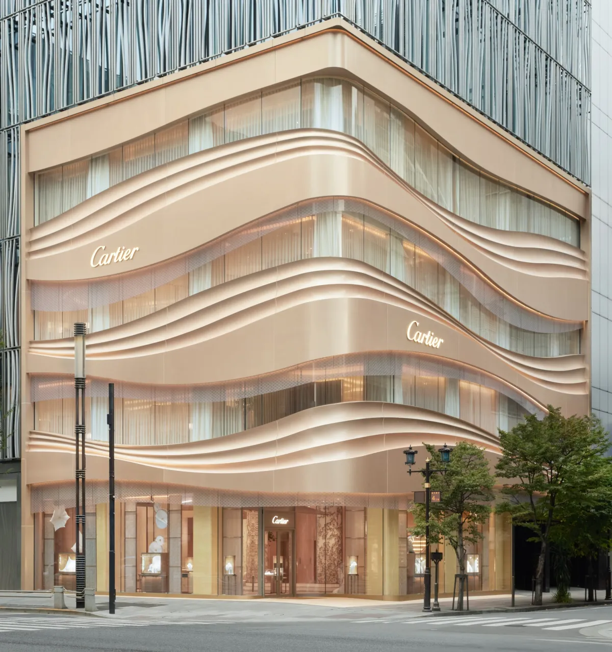 カルティエ 銀座4丁目ブティックのファサードは、周囲の直線的な街並みとは一線を画す滑らかな曲線美が特徴です。外観はジュエリーボックスを彷彿とさせ、奥行きと高さを感じさせるデザインが施されています。国文様「青海波」をモチーフにした幾何学模様が、繁栄への願いを込めた縁起の良いデザインとして親しまれています。