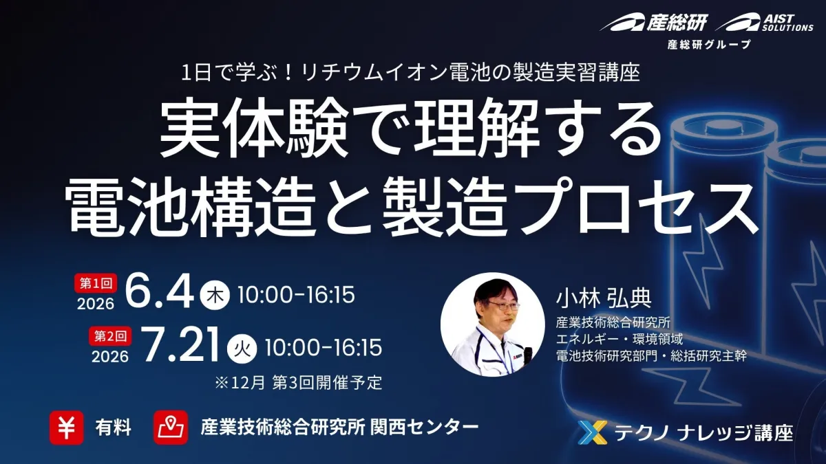 講座の開催日は、2026年6月4日と7月21日で、両日ともプログラムは同様です。場所は、産業技術総合研究所の関西センターにて、受講料金は55,000円(税込)です。お申し込みはそれぞれの締切日まで可能で、定員に達し次第締切となりますので、早めの申し込みをお勧めします。