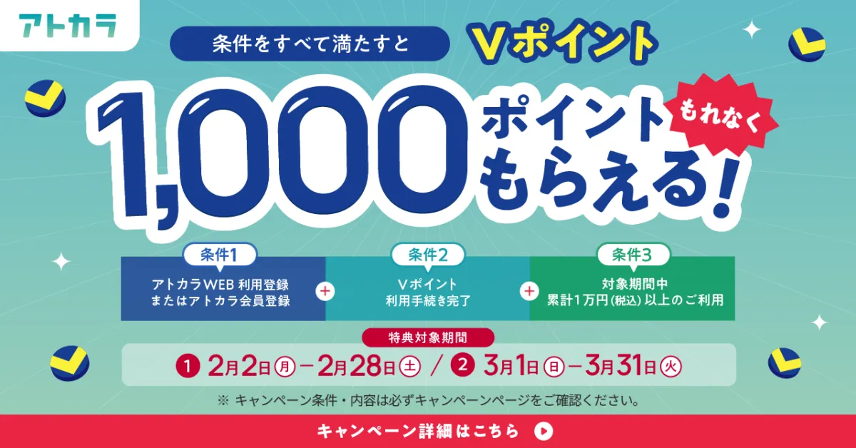 GMOペイメントゲートウェイ株式会社、GMOペイメントサービス株式会社、そして三井住友カード株式会社が共同で運営しているあと払いサービス「アトカラ」が、2026年2月2日から新たなキャンペーンを開始します。このキャンペーンでは、Vポイントをプレゼントする特典が用意されています。最大で1人当たり2,000ポイントがもらえるチャンスにもかかわらず、特典は各対象期間ごとに1,000ポイントになりますので、ぜひこの機会を逃さないようにその概要をチェックしてみてください。