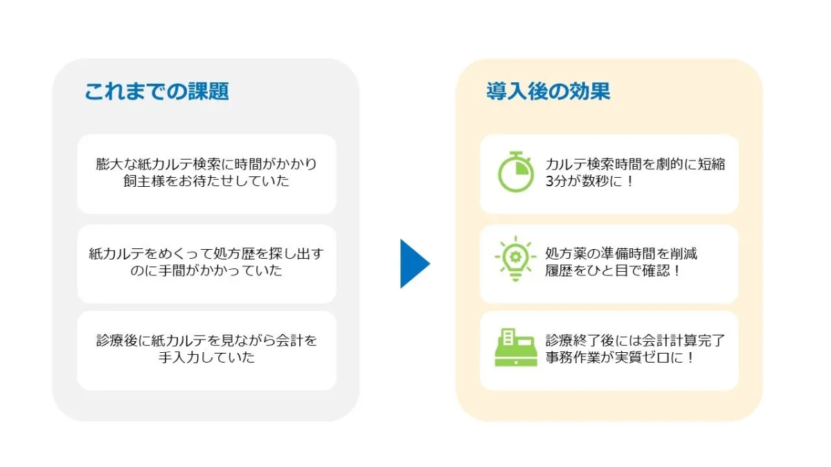 ほうじょう動物クリニックは、これまで約8000件もの紙カルテを管理しており、その運用に限界が生じていました。特に、保管スペースの逼迫や情報検索の非効率性、システムが分散していることによる情報共有の困難さが大きな課題となっていました。診療業務に支障をきたしている状況で、どうにかして業務をスムーズに進める必要がありました。