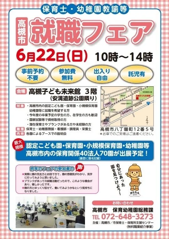 高槻市で開催される就職フェアは、現場で活躍する保育士と直接コミュニケーションが取れる絶好の機会です。この機会に、保育士の仕事内容や各保育施設の雰囲気をしっかりと把握し、今後のキャリア選択に役立てていただきたいと思います。是非、多くの方々のご参加をお待ちしております。