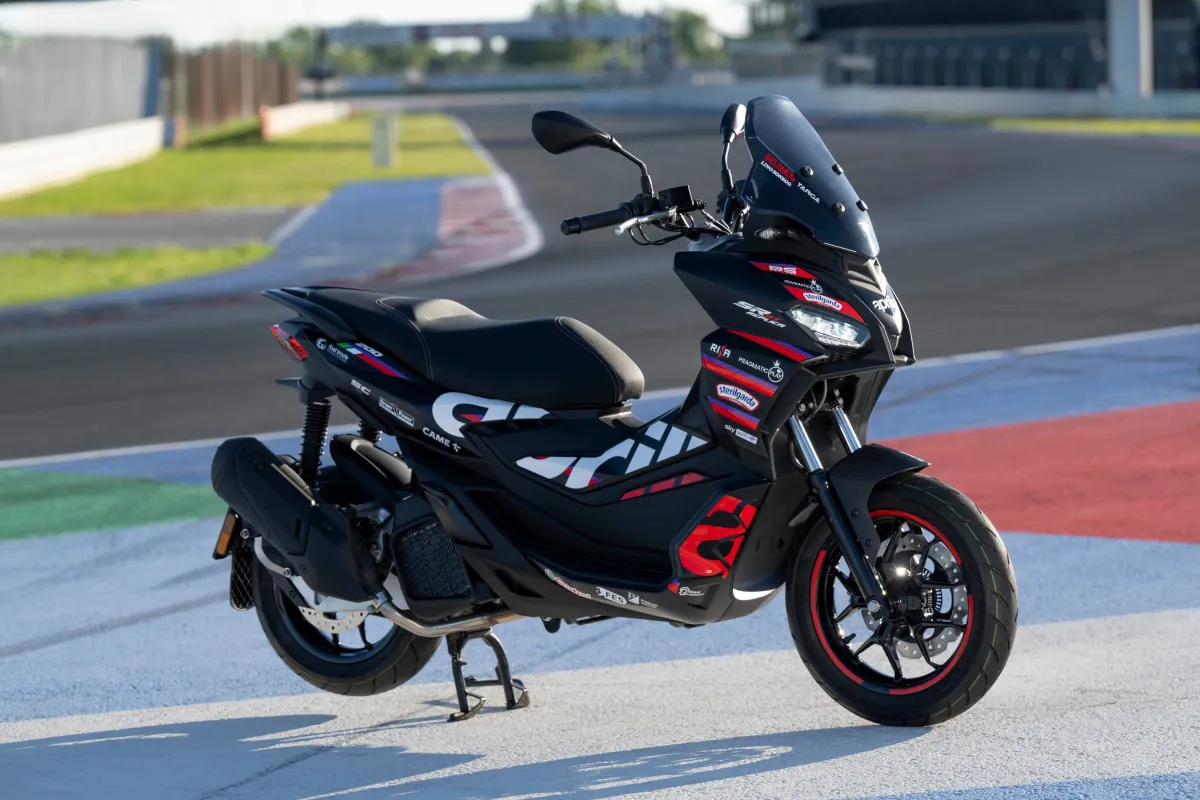 SR GT 200 レプリカは、そのスポーティでエクスクルーシブな外観にレーシングスピリットが色濃く反映されています。マットブラックのボディには、レッドとパープルのレーシンググラフィックが施されており、サイドにはアプリリアのロゴが大胆に配置されています。また、ブラックのフロントホイールにもレッドのストライプがあり、MotoGPで注目を集めるapriliaのマシンへの敬意が表現されています。この特別仕様は、市街地での走行においても際立った存在感を放つことでしょう。