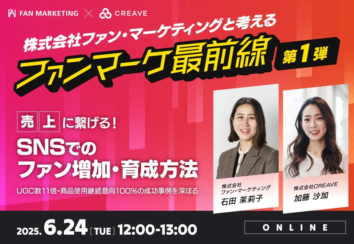 株式会社CREAVEが主催する「ファンマーケ最前線-第1弾」セミナーが、2025年6月24日にオンラインで開催されます。このセミナーはSNSを活用したファンの増加と育成方法に焦点を当て、参加者に対して実践的なノウハウを提供します。