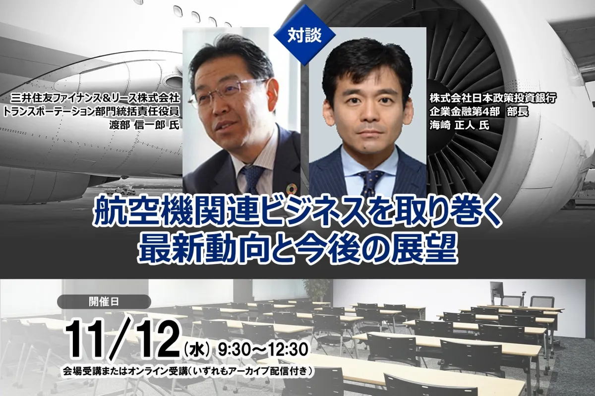 本セミナーでは、三井住友ファイナンス&リース株式会社の渡部信一郎氏と、株式会社日本政策投資銀行の海崎正人氏が登壇し、航空機関連ビジネスにおける現状と未来を語ります。特に、航空機リースやファイナンスに関する具体的な情報が提供され、参加者は業界の最新動向を学ぶことができます。