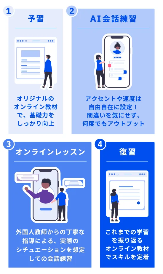MyBerlitz Speaking Tutorは、AIとの会話練習を可能にすることで、学習者がアウトプットを行う際に、間違いを気にせずに発話に集中できる環境を提供します。AIとの練習は何度でも行えるため、十分に準備を整えた状態でベルリッツの教師とのオンラインレッスンに臨むことができます。