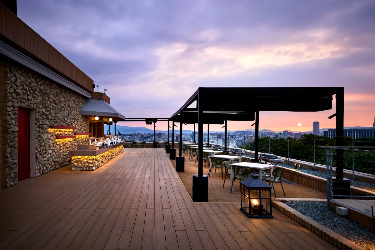 リニューアルオープンした『THE GARDEN BRASSERIE』は、ウッドデッキの先に広がるパノラマビューが魅力的です。来訪者は、空と風を感じながら、福岡の街並みと緑が調和した絶景を楽しむことができます。そして、夜には温かみのあるオレンジ色のランタンが点灯され、ダイナミックな夜景が訪れる人々を感動させます。