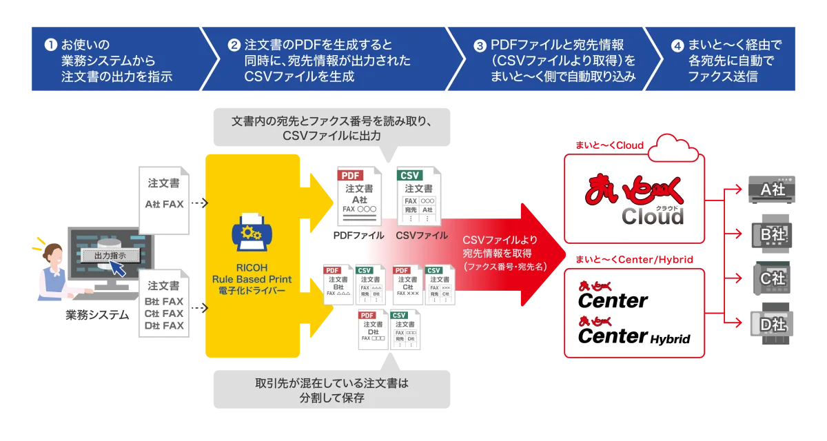 一方、まいと~くシリーズは、ファクスをペーパーレス化するためのソリューションとして多くの企業に導入されてきました。専用のファクス機や複合機を通じて、紙によるファクスのやり取りをデジタル化します。この連携により、RICOHのシステムが作成したPDFファイルをまいと~くが受け取り、手動での作業を必要とせずにファクスを自動送信できるようになります。