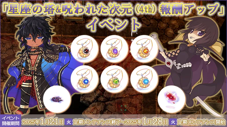 『ラグナロクオンライン』では、2025年1月21日から1月28日までの間、「星座の塔」と「呪われた次元(4th)」を対象にしたイベントが開催されます。この期間中は、これらのダンジョンの報酬が特別にアップしますので、装備やアイテムを集める絶好のチャンスです。