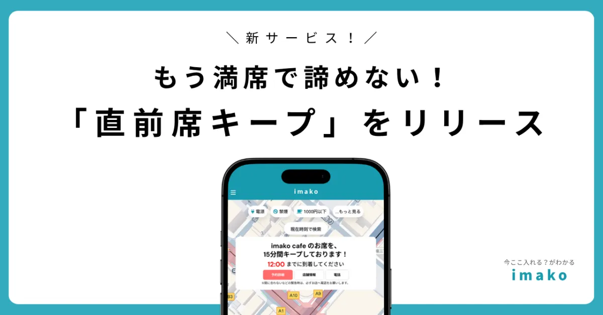 株式会社imako(本社:東京都渋谷区、代表取締役:浜田真衣)は、カフェの混雑情報をリアルタイムで提供するサービスを展開しています。この度、ユーザーが「今から行きたい」と思った瞬間に席を確保できる新しいサービス「直前席キープ」を始めました。この機能により、カフェの満席で迷うことなく、安心して訪れることができるようになります。