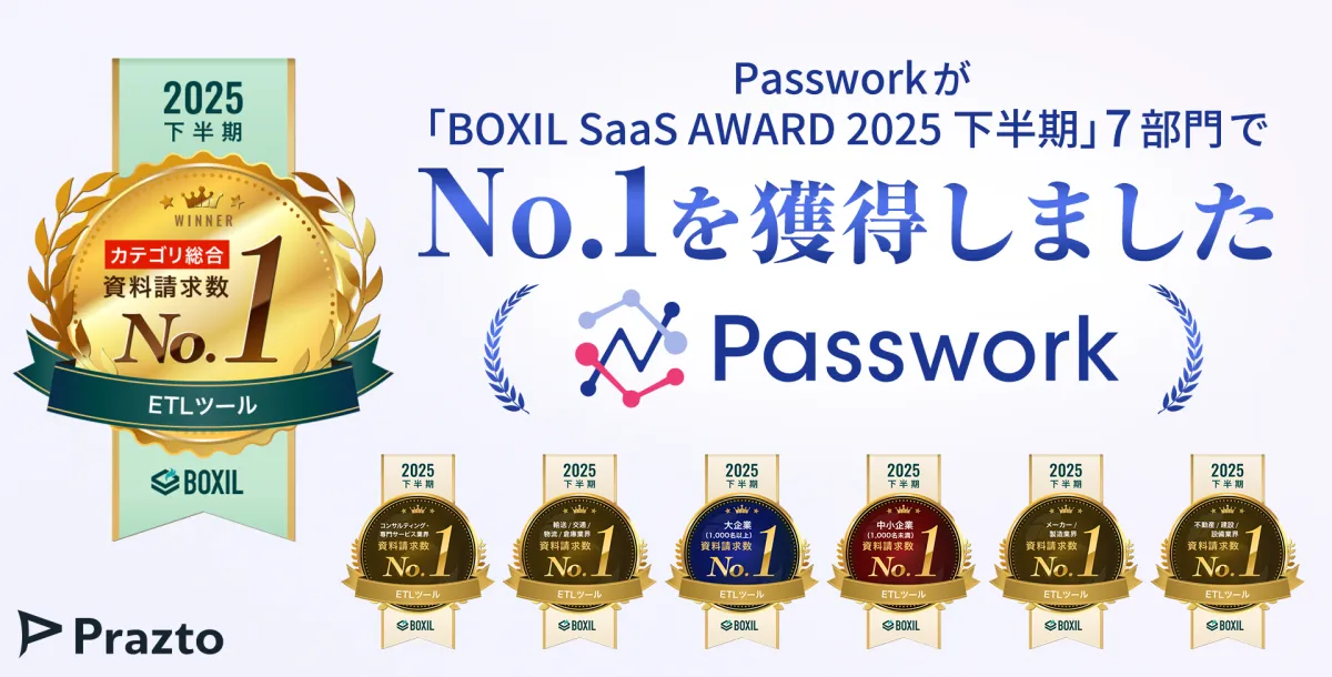株式会社Praztoが提供するデータ連携ツール「Passwork」が、スマートキャンプ株式会社主催の「BOXIL SaaS AWARD 2025 下半期」にて、ETLツール部門で7つの部門のうち全てでNo.1を獲得しました。この受賞は、同サービスの優れた機能や使いやすさが評価された結果です。