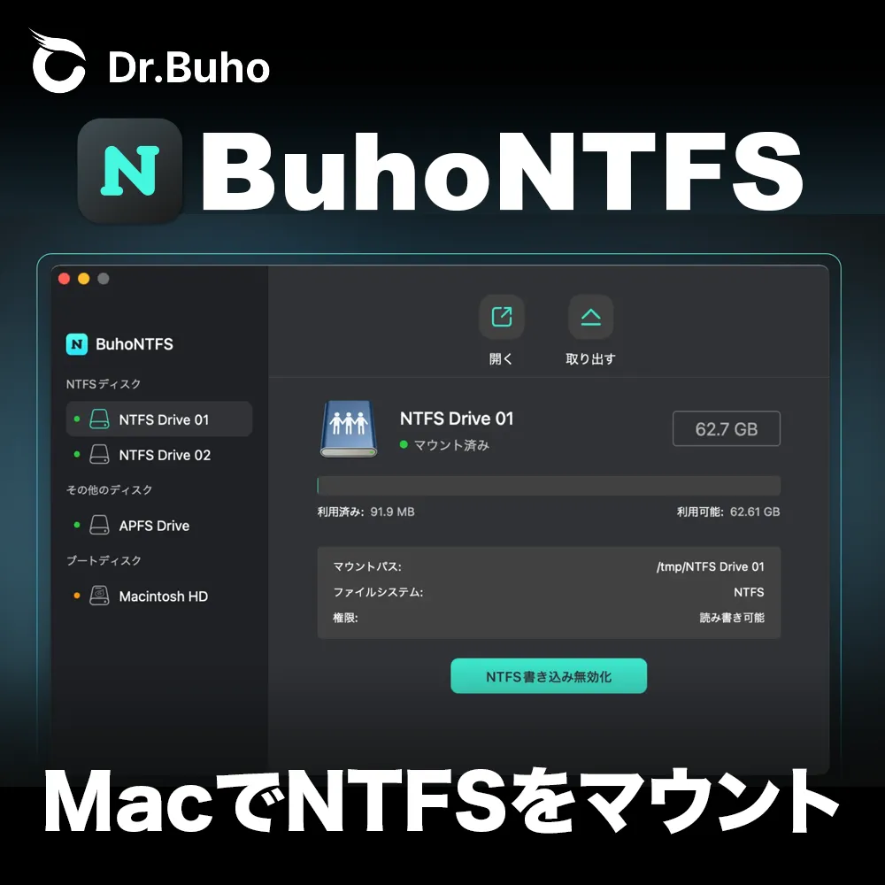 Macを使っていると、WindowsのNTFSドライブにアクセスしようとした時に、困ってしまうことがありますよね。特に、外付けHDDやUSBドライブがNTFSフォーマットの場合、macOSの制限により読み込みも書き込みもできないというトラブルがあります。そんな時に力強い味方となるのが、Dr.Buhoが提供する「BuhoNTFS」です!