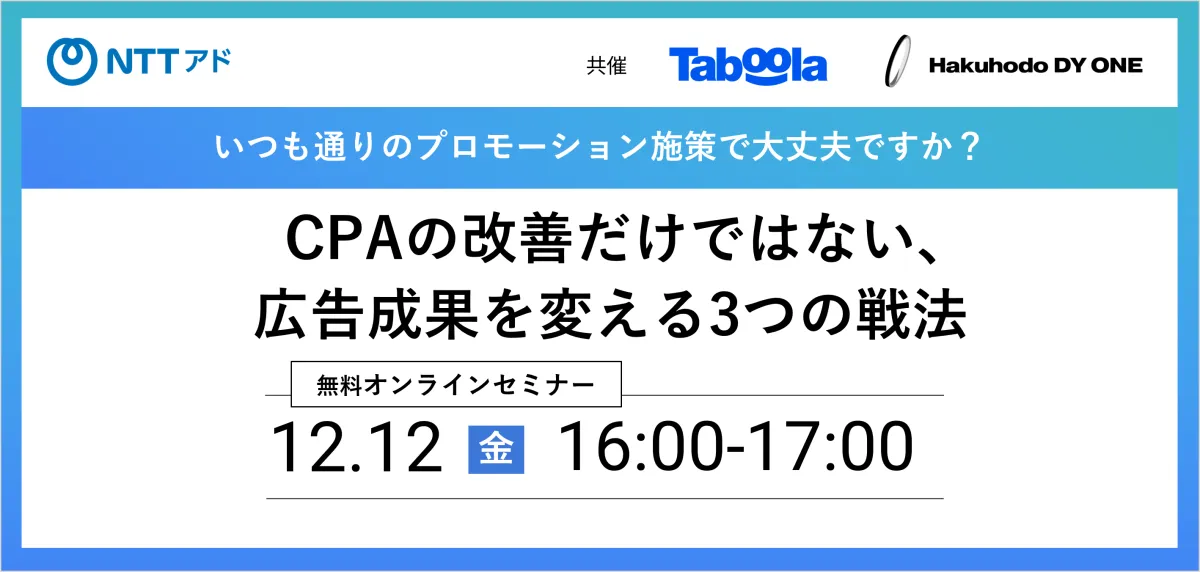 2025年12月12日(金)に、株式会社NTTアドがTaboola Japan株式会社や株式会社Hakuhodo DY ONEと共催のもと、無料ウェビナー「いつも通りのプロモーションで大丈夫ですか?CPAの改善だけではない、広告成果を変える3つの戦法」を開催します。このウェビナーでは、効果的な広告戦略を導入し、プロモーション活動の課題を克服するための知見を提供します。