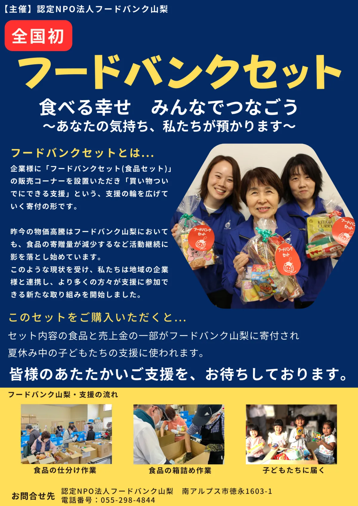 フードバンク山梨が実施する「フードバンクこども支援プロジェクト」では、今年度の支援件数が前年比の約2倍に達する見込みです。そのため、より多くの市民の協力が必要です。「今こそ、あなたの一歩が子どもたちの未来を支えます」といったメッセージが強調されています。お近くの参加店舗で『フードバンクセット』を購入する形で、手軽に支援活動に参加してみてください。