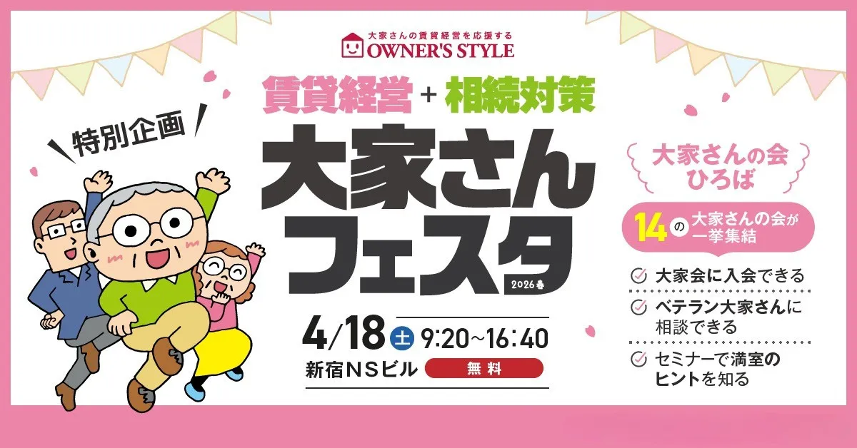 2026年4月18日(土)、新宿NSビルで開催される『賃貸経営+相続対策 大家さんフェスタ』では、およそ2万人以上のオーナー様が集まります。このイベントは、賃貸経営を行うために必要な情報を得る貴重な機会であり、新たなビジネスパートナーとの出会いも期待できます。