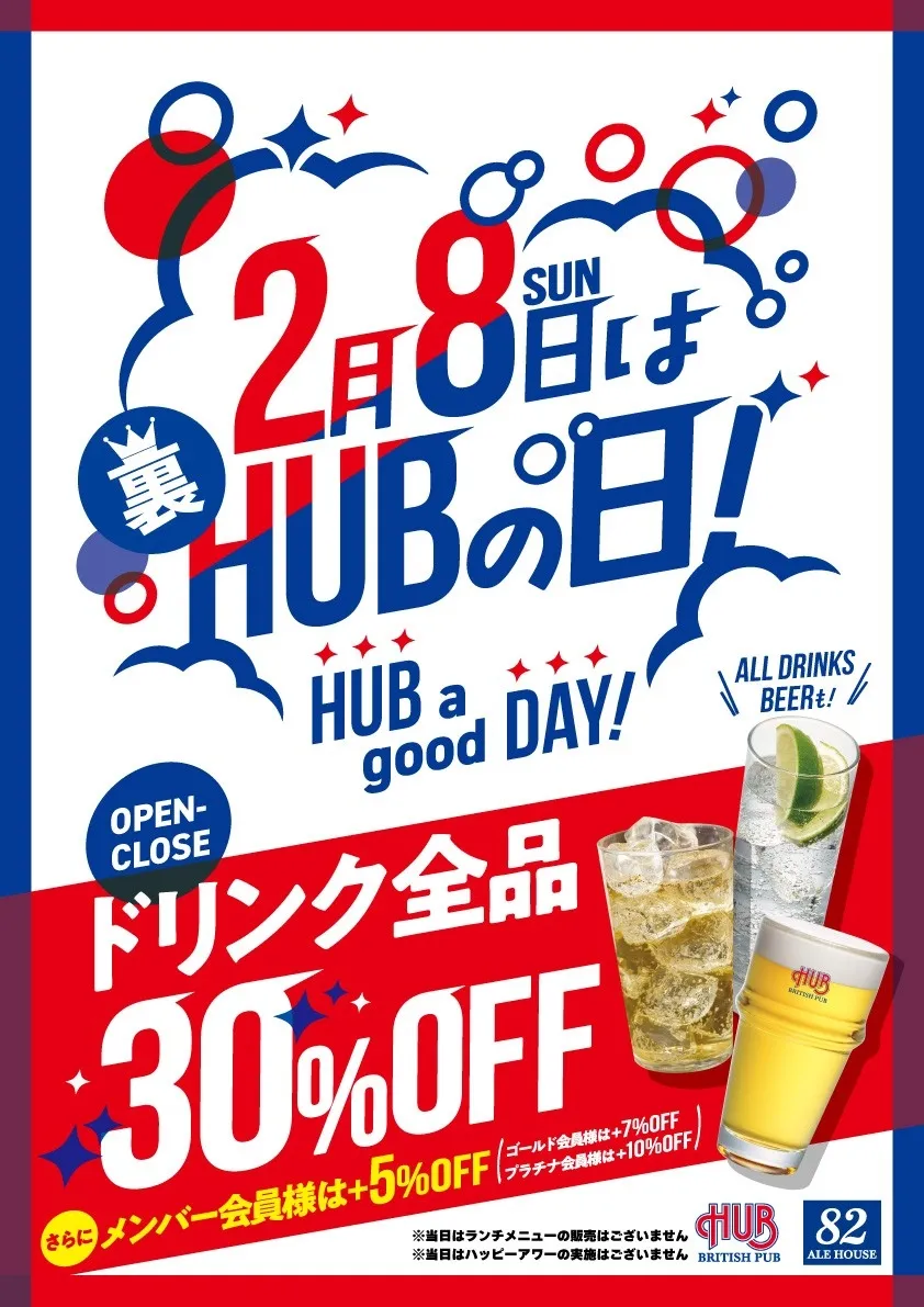 この機会を逃す手はありません!HUB・82全店では、通常の価格の30%OFFでドリンクを提供し、メンバー会員さんには特別な割引も用意されています。お得にドリンクを楽しみながら、特別なひとときを過ごしましょう。