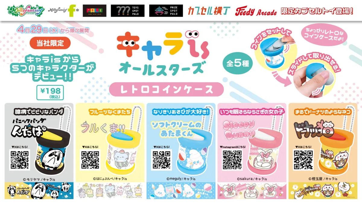 「キャラisオールスターズレトロコインケース」は、全5種でそれぞれ198円(税込)で販売されます。全長約4.2cmのかわいらしいデザインで、コインをセットしてスライドで取り出すことができるレトロなスタイルが特徴です。展開期間は無くなり次第終了とのことなので、気になる方は早めにゲットしてください。