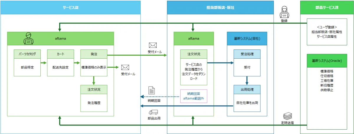 サービス店は過去の発注履歴や販売店の在庫状況を確認でき、ジャストインタイムな調達や在庫の最適化が実現します。
